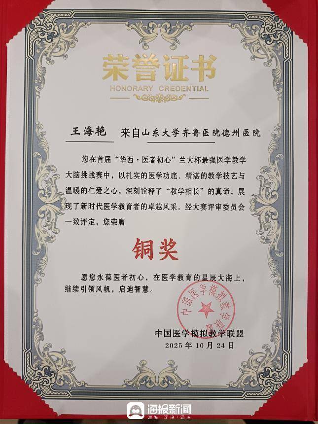 大众网记者 李磊 通讯员 李梦娇 德州报道近日,由中国医学模拟教学联盟主办的“华西·医者初心”兰大杯最强医学教学大脑挑战赛在兰州举行,山东大学齐鲁医院德州医院感染性疾病科执行主任、副主任医师王海艳以扎实的医学功底、精湛的教学技艺、温暖的仁爱之心,从全国40余所医学院校130名初赛选手中脱颖而出,历经复赛(48人)、决赛(12人)两轮激烈角逐,最终斩获铜奖,医院急诊科主任医师王荣喜在本次评选中荣获“十佳医学模拟教师”称号。
